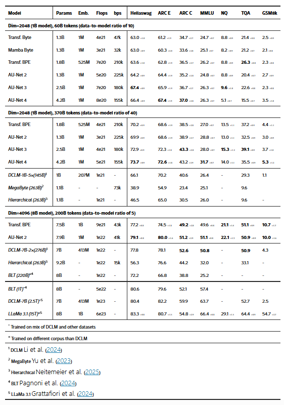 사전학습(pretraining) 연산량을 정밀하게 조정하고 제어하면, 얕은 계층 구조는 강력한 BPE 기준 모델들과 유사한 성능을 보이며, 더 깊은 계층 구조는 유망한 성능 향상 추세를 나타냅니다. 이제 토크나이제이션이 모델 내부에 포함되기 때문에, 동일한 시스템이 문자 수준(character-level)의 작업도 처리할 수 있고, 저자원 언어 간에도 지식을 공유할 수 있게 됩니다.