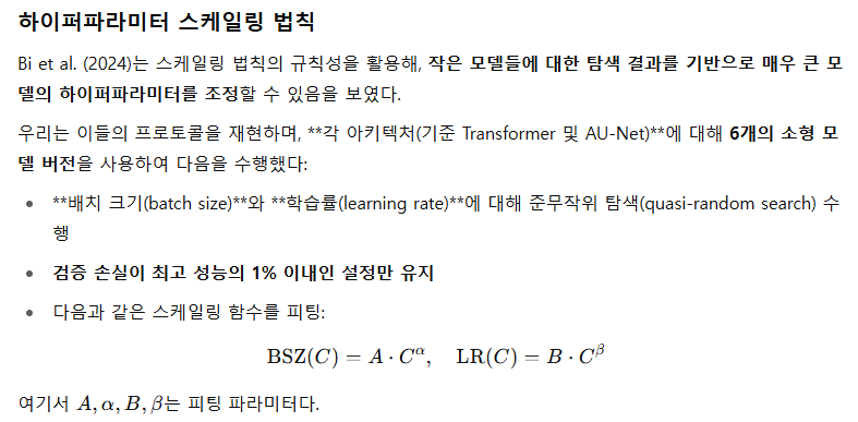Bi et al. (2024)은 작은 모델들에 대해 다양한 학습률과 배치 크기를 탐색(sweep)한 후, 그 결과를 바탕으로 큰 모델에 대한 최적의 하이퍼파라미터를 예측할 수 있음을 보였다. 우리는 이들의 방법론을 따라, 우리의 설정에서의 데이터와 계층적 모델(hierarchical model)의 구조로 인해 하이퍼파라미터가 다르게 진화함을 보여준다. 이 하이퍼파라미터를 이용해, 다양한 연산량에 대해 스케일링 법칙(scaling laws)을 실험하고, 기준 아키텍처(BPE 기반 Transformer)와 AU-Net을 비교한다.