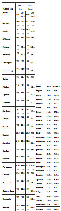 그럼에도 불구하고, 많은 벤치마크에서 우리의 AU-Net 모델들과 BPE 기준선 모두