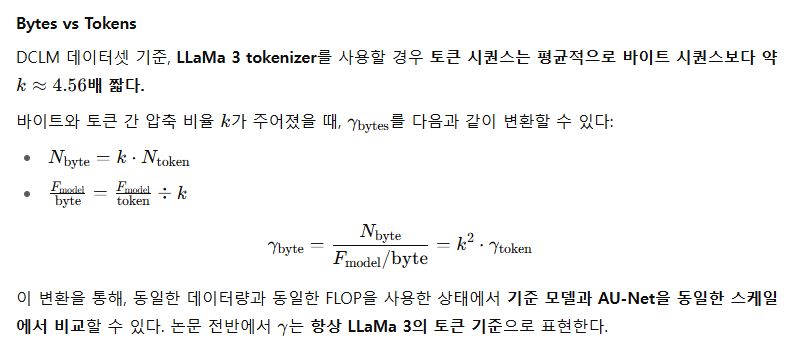예를 들어, AU-Net이나 바이트 기반 모델을 2730억 바이트 학습 데이터로 학습했다면, 이는 DCLM 기준 압축률 4.56을 반영해 600억 토큰으로 변환하여 LLaMa 3 토크나이저 기반 Transformer에 사용되었다(Grattafiori et al., 2024).