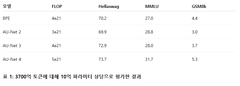 - 2단계 및 3단계 AU-Net 모델은 연산량을 엄격히 통제할 경우, BPE 기준선과 동등한 성능을 달성할 수 있다.