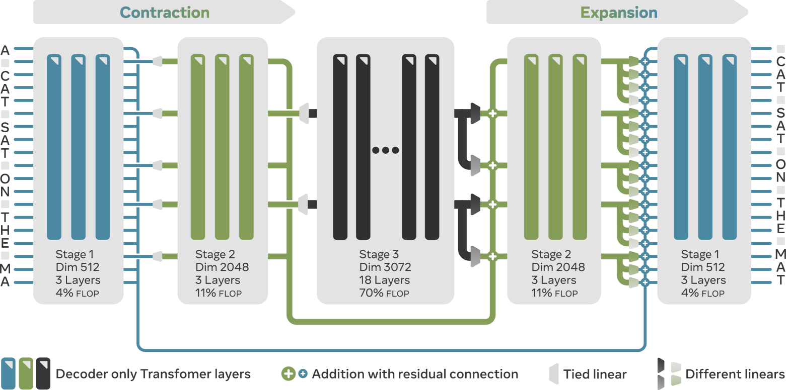 실제로는 토크나이저를 완전히 없애고, 바이트부터 4단어 단위까지 모델 내부에서 동적으로 처리한다는 점이 혁신적입니다.
