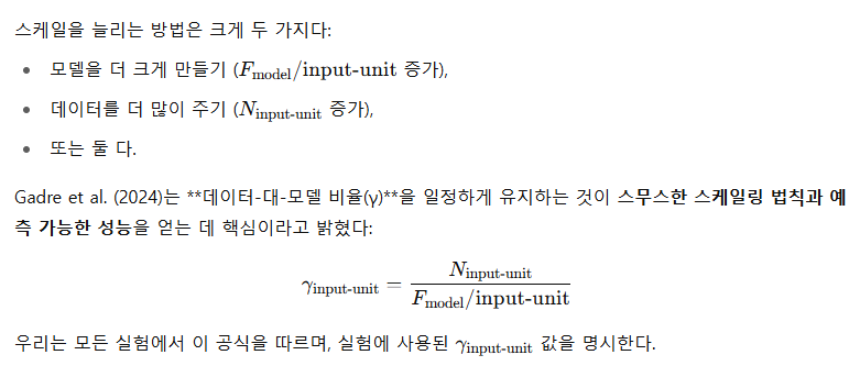 데이터-대-모델 비율(data-to-model ratio)은 10으로 설정되었다. 이는 Kaplan et al. (2020)에서 제시한 최적 비율의 약 2배에 해당한다.