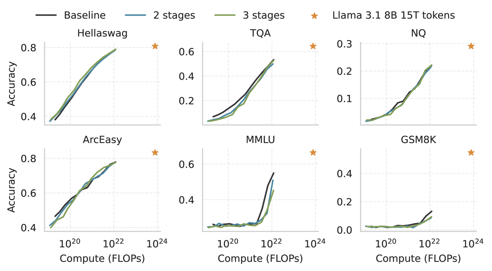 → 3단계 모델은 1e22 FLOP 수준에서 성능을 따라잡는다. - 반면, GSM8K와 MMLU에서는 1e22 FLOP 수준에서도