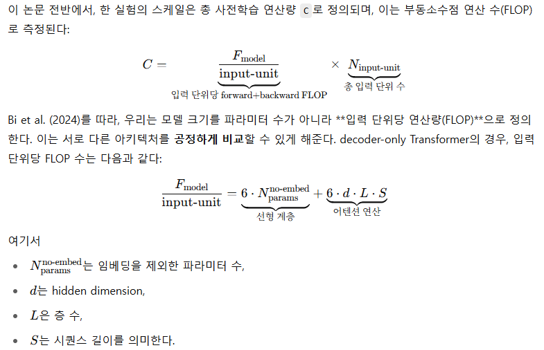 대규모 언어 모델은 매우 예측 가능하게 스케일링되는 것으로 알려져 있다(Kaplan et al., 2020; Hoffmann et al., 2022; Bi et al., 2024). 이러한 특성 덕분에, 우리는 큰 연산량(compute budget)이 주어졌을 때 모델의 성능을 어느 정도 사전에 추정할 수 있다. 더욱 흥미로운 점은, 이를 통해 실제 실험보다 훨씬 큰 모델에 대한 최적 하이퍼파라미터도 예측할 수 있다는 것이다.