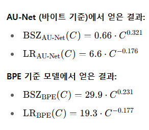 - C5. 안정적인 스케일링 법칙: 토큰 수준에서 바이트 수준으로 넘어가면서 새로운 배치 크기 및 학습률 공식이 필요함을 보이고, 이를 통해 매끄러운 최적화가 가능해진다.