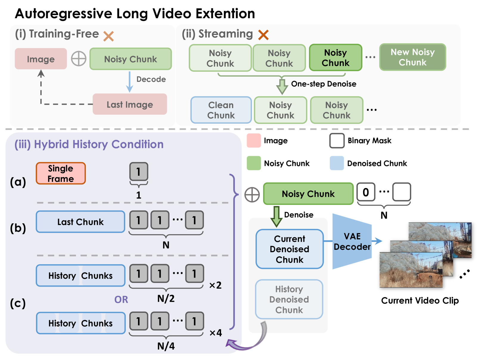 - 우리는 하이브리드 히스토리 조건 기반(hybrid history-conditioned) 비디오 확장 방식을 제안합니다. 이 방식은 기존에 제거된 노이즈 정보를 기반(historical denoised chunks)으로, 새로운 잠재 벡터(latent)를 자동회귀 방식으로 제거(denoise)하며 시퀀스를 확장합니다 (4.2절).