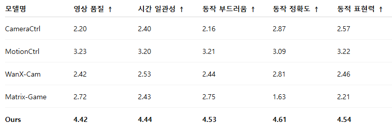 우리는 동일한 게임 시나리오 하에서 현재 가장 앞선 오픈소스 게임 상호작용 모델인 Matrix-Game과 포괄적인 비교를 수행했습니다. 두 모델은 동일한 기반 모델 [18]을 사용함에도 불구하고, Hunyuan-GameCraft는 생성 품질, 동적 성능, 제어 정확도, 시간적 일관성 등 대다수 핵심 지표에서 의미 있는 개선을 달성하였으며, 이는 표 2에서 확인할 수 있습니다.