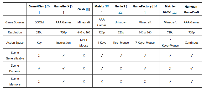 최근 연구들은 비디오 생성 모델을 활용하여 게임 장면에서의 동적 예측 및 상호작용 능력을 향상시키는 데 점차 초점을 맞추고 있습니다. 표 1에서는 최근의 주요 연구들을 정리하였습니다.