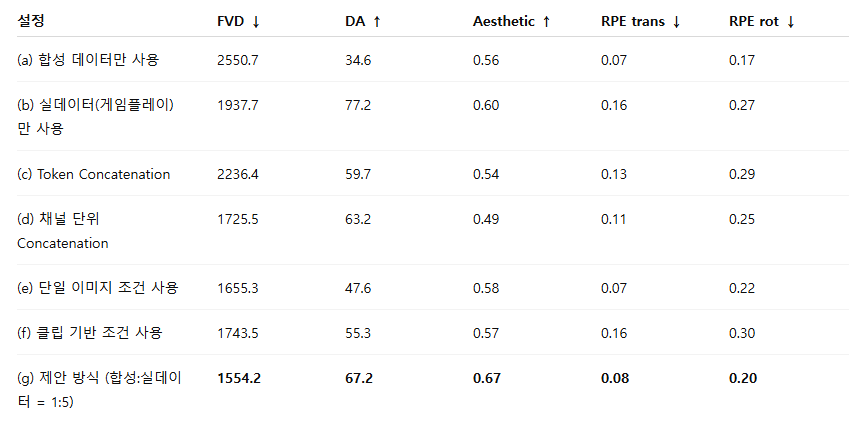 합성 데이터와 실제 게임 데이터 각각의 기여도를 이해하기 위해 구성 요소 제거 실험을 수행하였습니다.