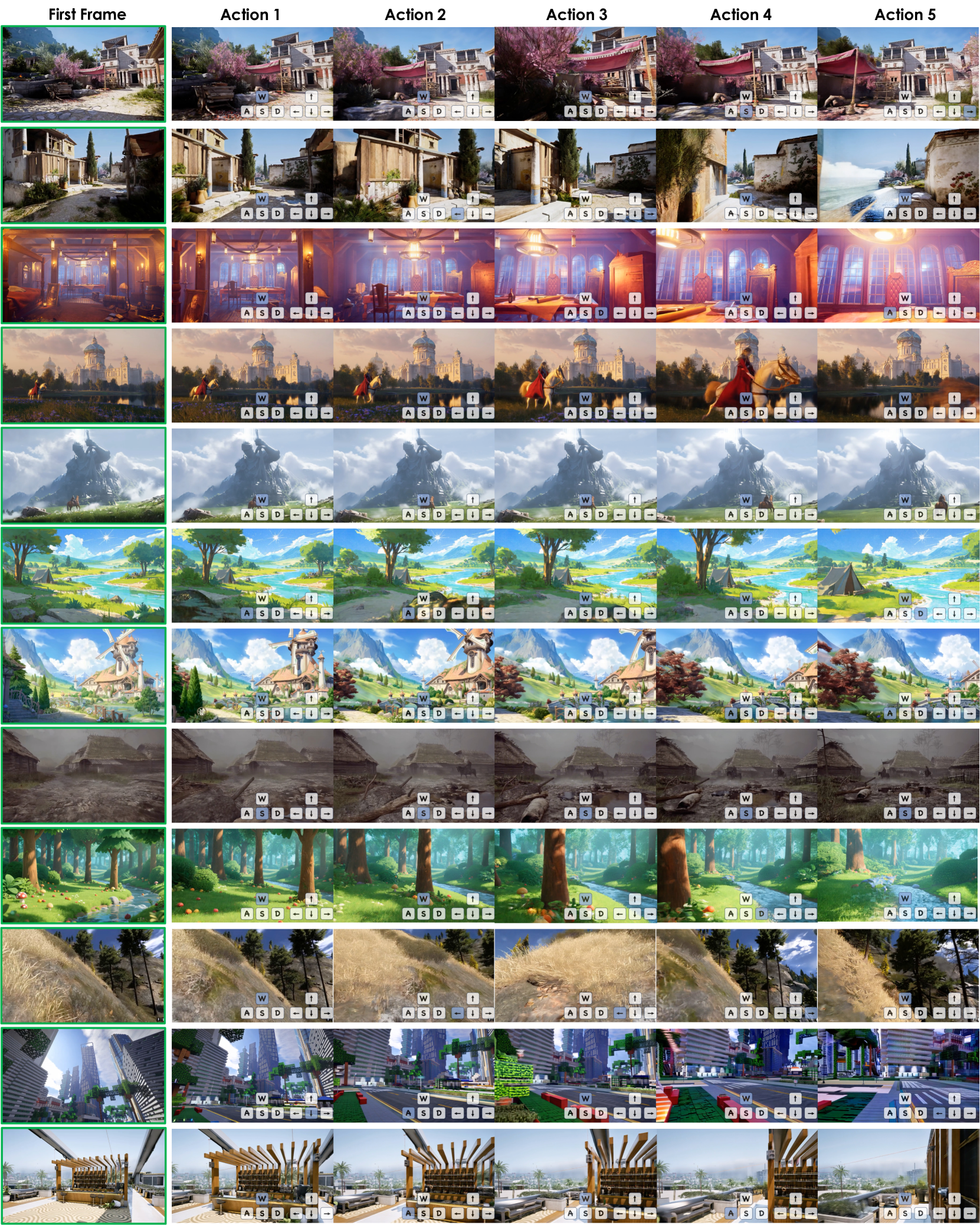 그림 1: Hunyuan-GameCraft는 단일 이미지와 이에 대응하는 프롬프트만으로도 높은 동적 표현력을 갖춘 인터랙티브 게임 영상 콘텐츠를 생성할 수 있습니다. 우리는 일련의 동작 신호(action signals)를 시뮬레이션하고, 좌우 프레임에는 서로 다른 입력에 따라 생성된 게임 영상 시퀀스의 주요 순간들이 나타나 있습니다. Hunyuan-GameCraft는 각 상호작용에 맞춰 정밀하게 콘텐츠를 생성할 수 있으며, 시간적 및 3D 일관성을 유지하면서 장기적인 비디오 생성도 지원합니다. 또한 시퀀스 전체에서 과거 장면 정보의 보존도 효과적으로 수행됩니다. 이 경우에도 W, A, S, D는 이동을, ↑, ←, ↓, →는 시야 각도의 변화를 나타냅니다.