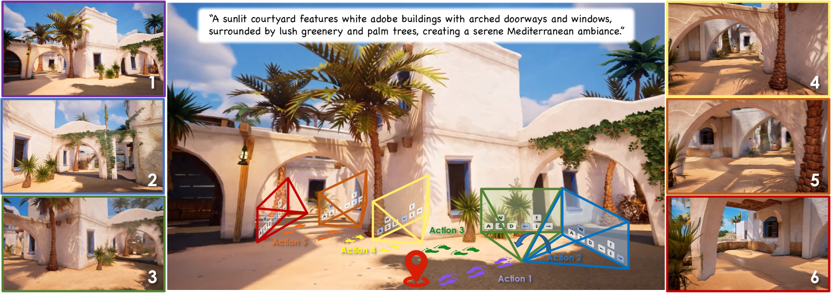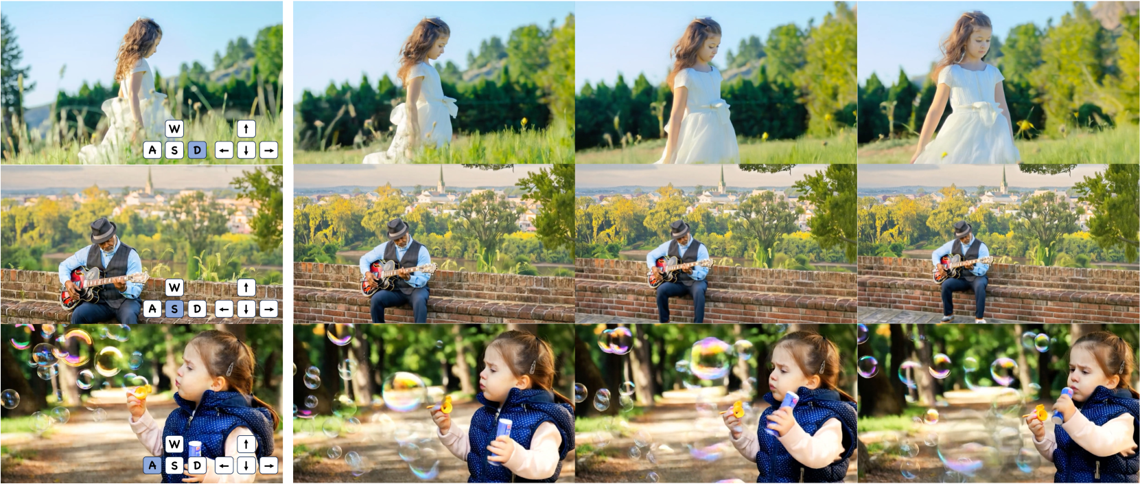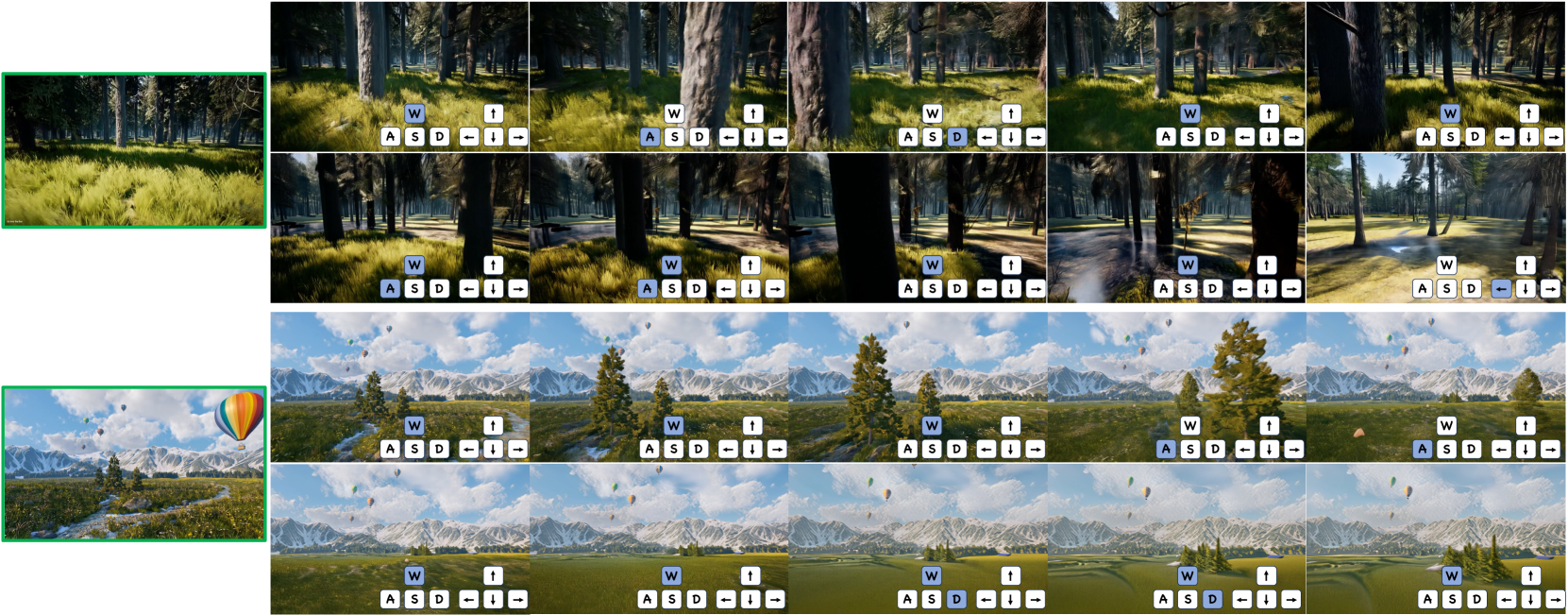 그림 2: Hunyuan-GameCraft의 다중 동작 제어(multi-actions control) 결과 예시입니다. 파란색으로 점등된 키는 눌린 상태를 나타냅니다. W, A, S, D는 이동(transition movement)을, ↑, ←, ↓, →는 시야 각도(view angle)의 변화를 의미합니다.