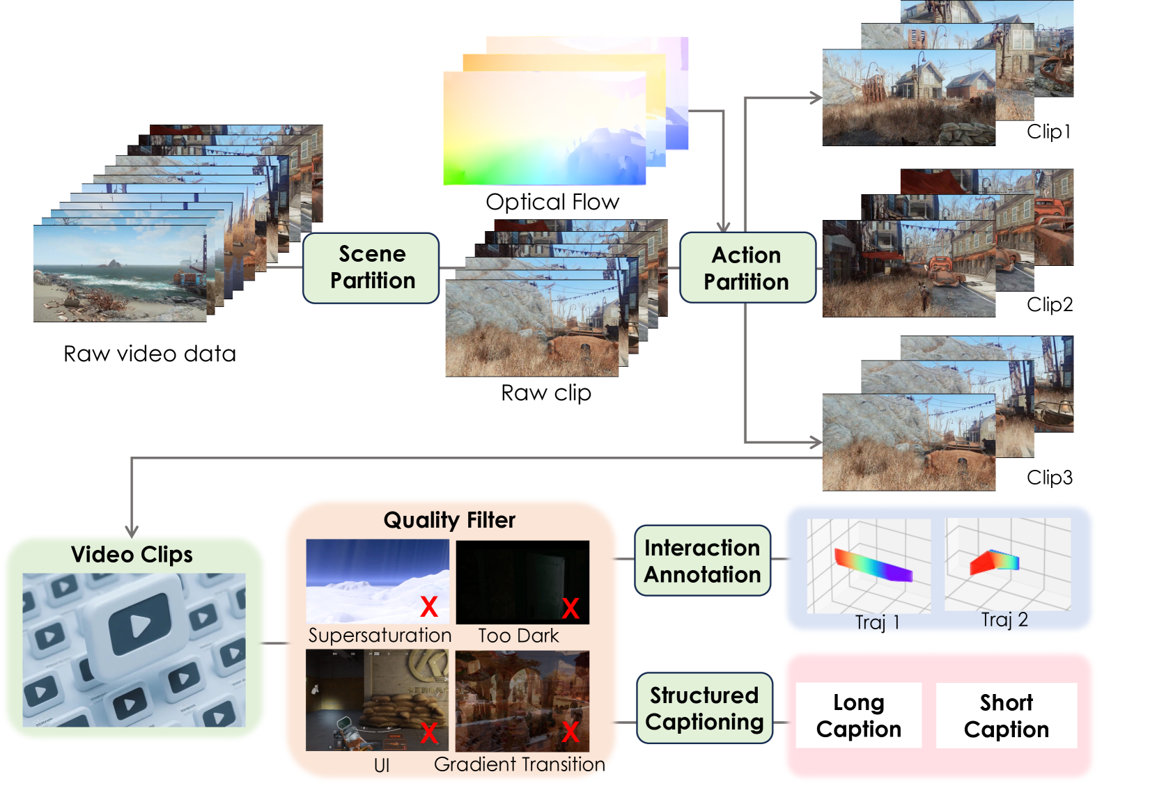 우리는 Assassin’s Creed, Red Dead Redemption, Cyberpunk 2077 등 100개 이상의 AAA 게임 타이틀을 선별하여, 고해상도 그래픽과 복잡한 상호작용이 포함된 다양하고 풍부한 데이터셋을 구성하였습니다. 그림 3에서 볼 수 있듯이, 우리의 엔드 투 엔드 데이터 처리 프레임워크는 총 4단계로 구성되며, 주석이 포함된 게임플레이 데이터의 부족 문제를 해결함과 동시에 카메라 제어 기반 비디오 생성의 새로운 기준을 제시합니다.