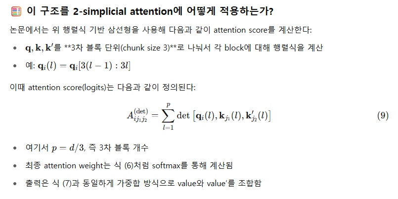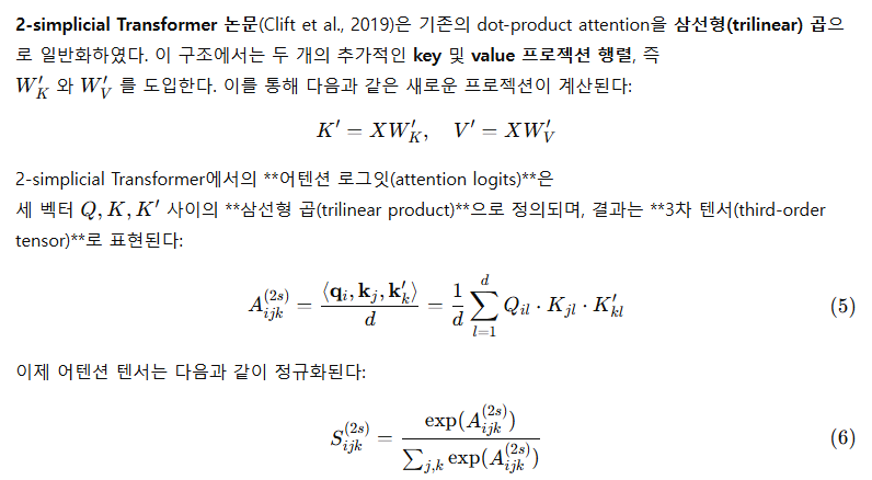 2-simplicial Transformer는 Clift et al. (2019)에서 처음 제안된 구조로, 기존의 dot-product attention을 쌍선형(bilinear) 형태에서 삼선형(trilinear) 형태로 확장하였다. 이는 기하학적으로 1-simplex(두 노드 간의 선)에서 2-simplex(세 노드가 이루는 삼각형)으로 일반화한 것과 같다.