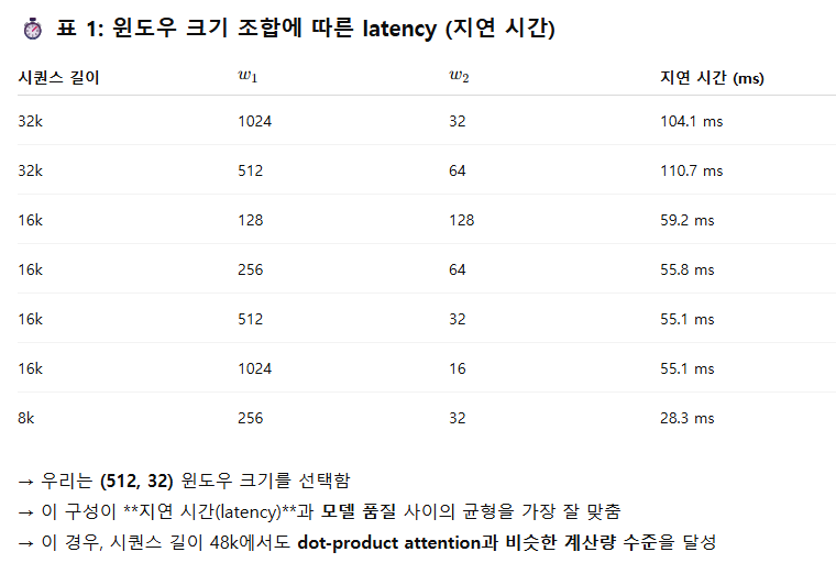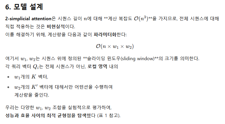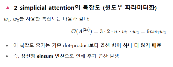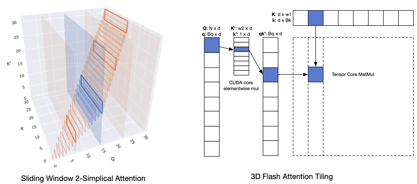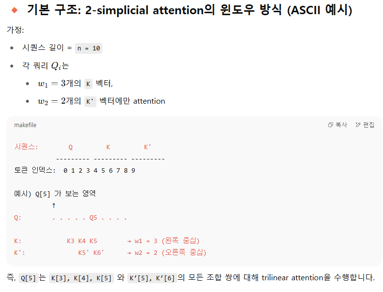 - 왼쪽: 슬라이딩 윈도우 기반 2-simplicial attention 시각화. 각 Qᵢ는 [w₁, w₂] 모양의 영역 안의 K, K′를 attend함.