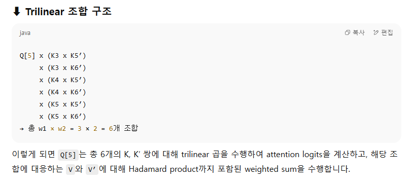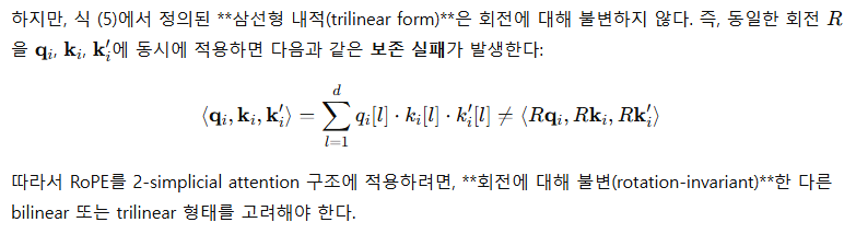 이러한 맥락에서, 우리는 Transformer의 점곱(dot-product) 어텐션을 삼중선형 형태(trilinear form)로 일반화한 Clift et al. (2019)의 오래된 연구를 다시 조명한다. 이 구조는 2-simplicial Transformer로 불린다. 우리는 또한 RoPE(Su et al., 2024)를 삼중선형 함수로 일반화하는 방식을 탐색하고, 회전 불변(rotation-invariant)을 가지면서도 2-simplicial attention만큼 표현력이 뛰어난 삼중선형 형태를 제시한다.