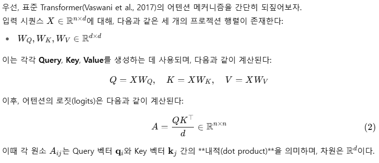 Vaswani et al. (2017)의 기념비적인 연구 이후, 어텐션 메커니즘의 일반화를 시도한 다양한 연구들이 제안되었다. 가장 초기의 흐름 중 하나는 시퀀스 길이에 따른 어텐션의 이차 복잡도(quadratic complexity)를 줄이려는 시도였다. 특히 Parmar et al. (2018)은 이미지 생성 문맥에서 로컬 어텐션(local attention)을 제안하였고, 이후 여러 연구들(Zaheer et al., 2020; Roy et al., 2021)은 이를 언어 모델링에 다른 방법들과 결합해 적용하였다.