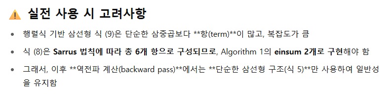 ⟨𝐚, 𝐛, 𝐜⟩ = ∑₍ᵢ₌₁₎ᵈ ⟨𝐚ᵢ, 𝐛ᵢ, 𝐜ᵢ⟩ 로 표기한다. - 행렬 곱셈은 @ 기호로 나타내며, 예: (A B) @ C.