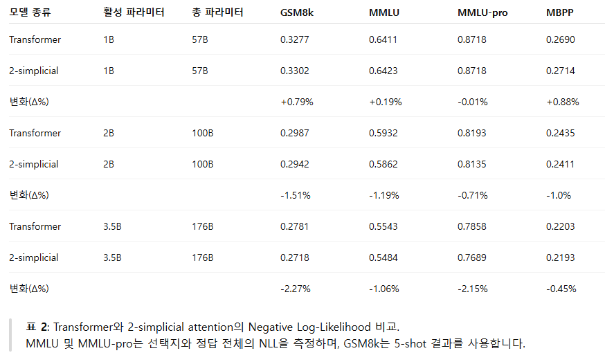 모델 규모가 1B → 3.5B로 커질수록 NLL 감소량(Δ)이 더 커지는 현상이 관측됩니다. 즉, 2B 미만의 작은 모델에서는 2-simplicial attention이 이득을 주지 않지만, 일정 이상으로 모델이 커지면 성능 향상 효과가 나타납니다.