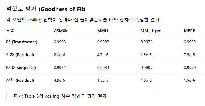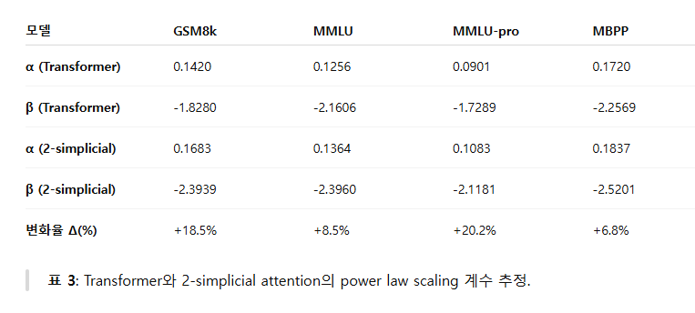 나아가 우리는 2-simplicial Transformer가 제한된 토큰 예산 하에서 Transformer보다 더 우수한 확장성을 가진다는 것을 보인다. 동일한 토큰 수를 사용했을 때, 유사한 크기의 2-simplicial Transformer가 수학, 코딩, 추론 과제에서 기존 Transformer보다 더 나은 성능을 보여준다. 뿐만 아니라, 실험 결과에 따르면 2-simplicial Transformer는 모델 파라미터 수에 대한 스케일링 지수 역시 더 유리한 방향으로 변화함을 확인할 수 있었다. 이는 기존의 Chinchilla 스케일링(Hoffmann et al., 2022)과 달리, 2-simplicial Transformer는 파라미터 수를 늘릴 때 토큰 수를 더 느린 속도로 증가시켜도 되는 가능성을 시사한다.
