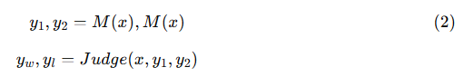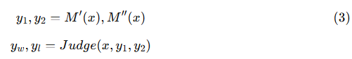 기존 선호 데이터 수집 방식과 CLAIR의 가장 큰 차별점은 데이터 생성 방식이다. 예를 들어, on-policy judge paradigm(Reinforcement Learning from AI Feedback; Bai et al. 2022)에서는 다음과 같이 두 출력을 모델 M(x)에서 샘플링하고, 판정자(Judge)가 승자와 패자를 결정한다.
