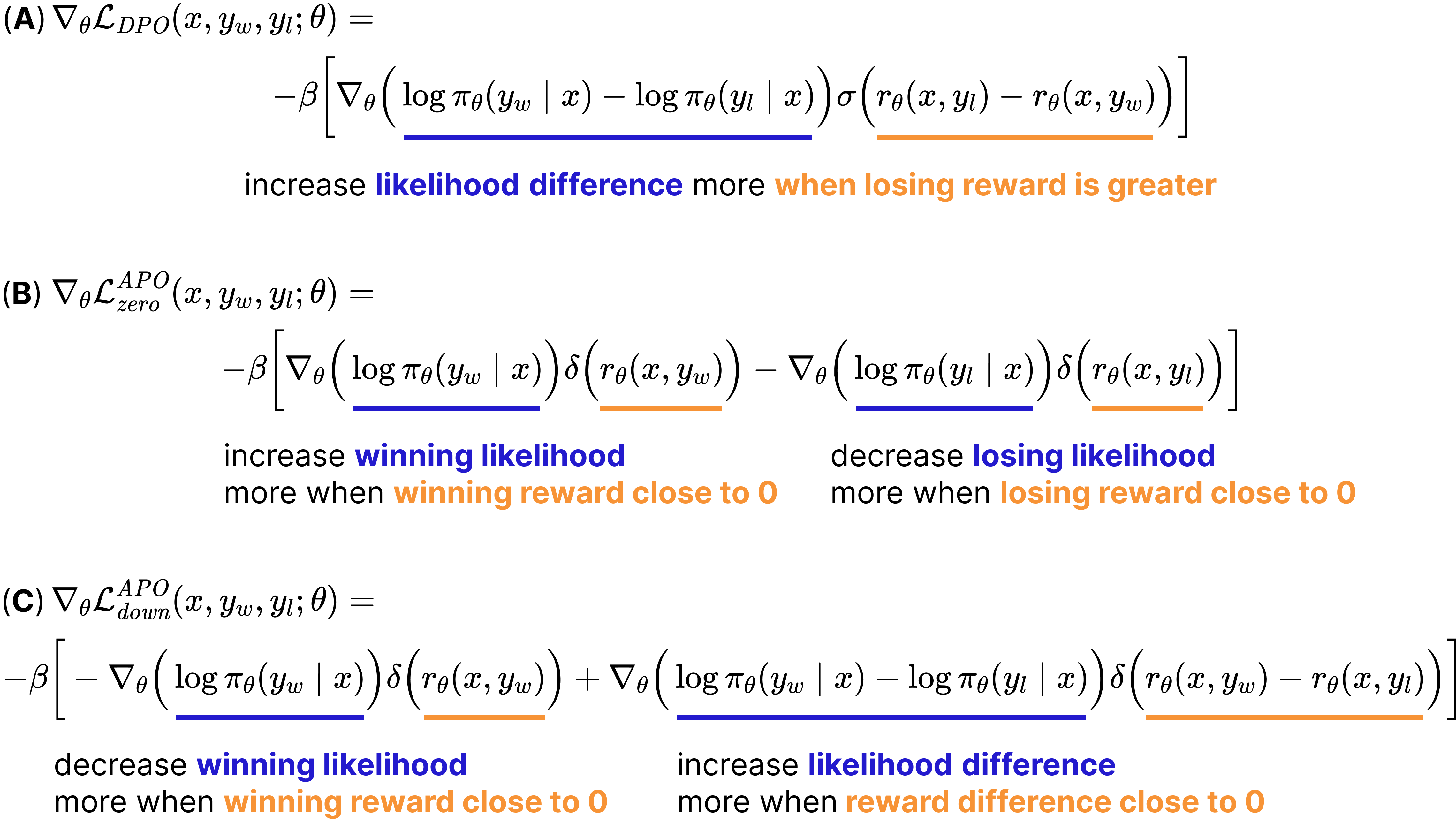 DPO(식 A), APO-zero(식 B), APO-down(식 C)의 그래디언트를 비교한 것이다.