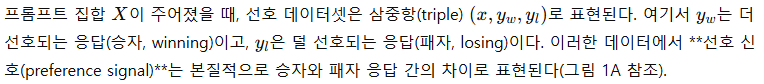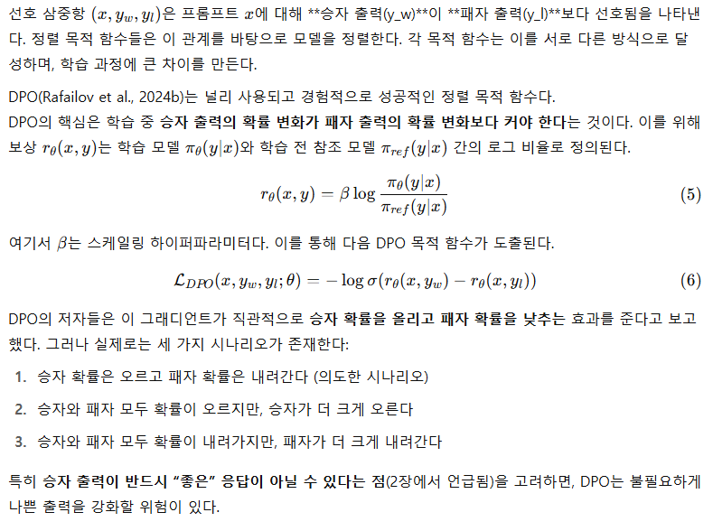 의 선호 쌍(preference pair) 형태로 표현될 수 있으며, 이는 단일 출력보다 풍부한 학습 신호를 제공하고 더 표현력 있는 학습 목적을 가능하게 한다. 최근에는 대조 학습 목적(contrastive learning objectives)을 통해 정렬이 보다 쉽게 수행될 수 있게 되었다(Rafailov et al., 2024b).