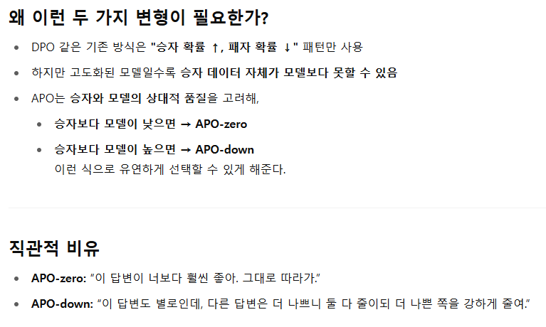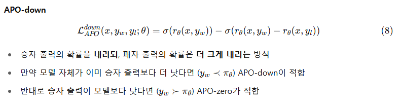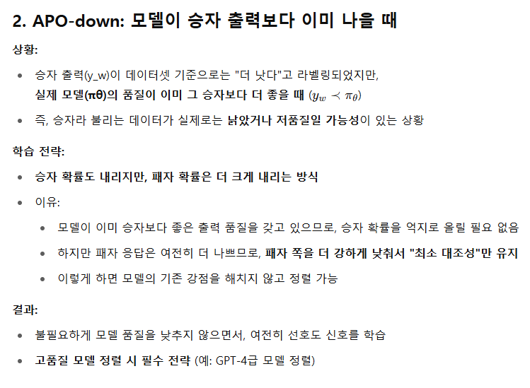 - 승자 출력이 대상 모델보다 품질이 낮을 때 → APO-down이 더 적합 (예: off-policy judge 데이터셋)