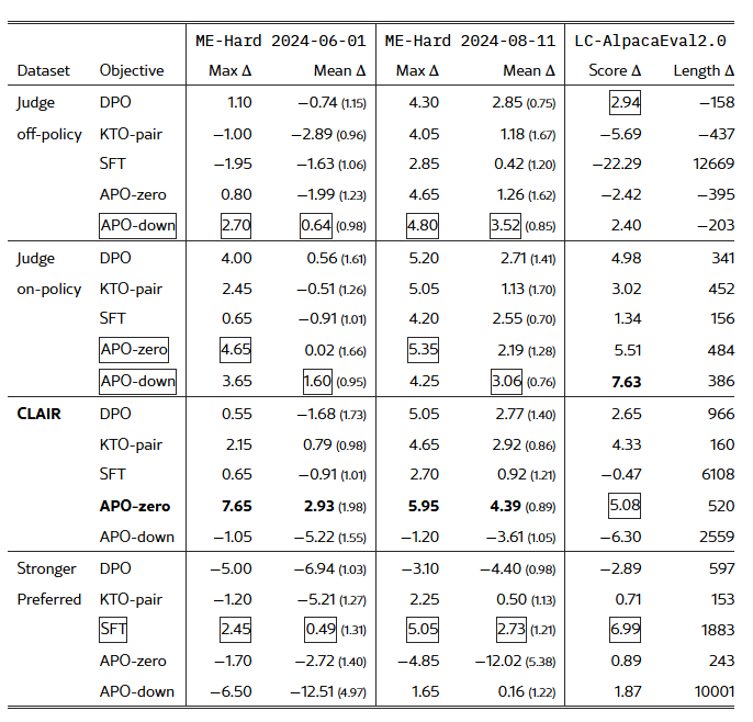 Llama-3-8B-Instruct를 정렬하는 실험에서, CLAIR 선호 쌍은 네 가지 비교 가능한 선호 데이터셋 중 가장 높은 성능 향상을 보였으며, APO 계열은 기존 정렬 목표 대비 일관되게 우수한 성능을 달성했다.