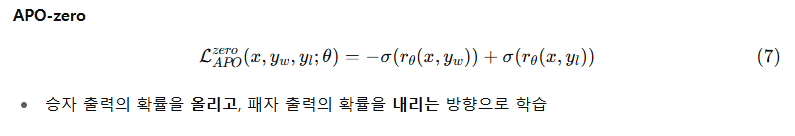 - APO(Anchored Preference Optimization): 맞춤형 학습 동역학을 제공하는 정렬 목적 함수 계열