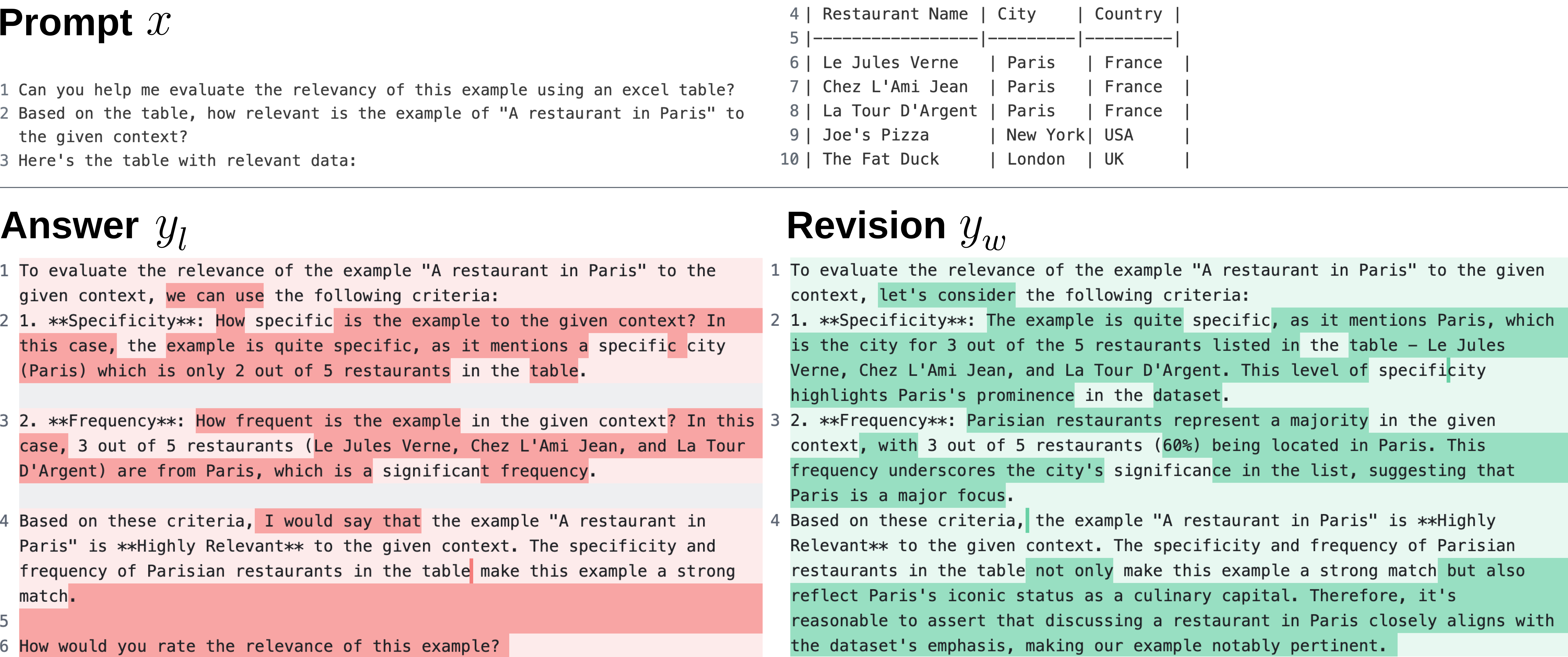 프롬프트에 대한 Llama-3-8B-Instruct의 응답과, 이에 대한 GPT4-turbo의 수정(revision) 예시. 두 응답 간 차이가 하이라이트되어 있으며, 수정본은 원래 응답의 개요는 유지하면서도 개선 가능한 부분을 향상시켰다. 예를 들어, 원본에서 잘못된 파리 식당 수(2개)를 수정본에서는 정확히 3개로 고쳤다.