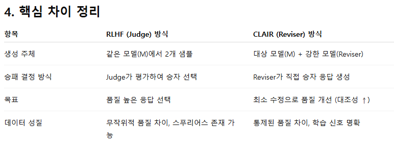 - CLAIR(Contrastive Learning from AI Revisions): 더 나은 대조성을 가진 선호 쌍을 생성하는 데이터 제작 기법