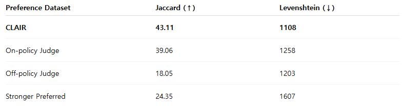 CLAIR의 핵심 목표 중 하나는 최소 대조성(minimally contrastive) 선호 쌍을 만드는 것이다. 이를 평가하기 위해 두 가지 단순한 휴리스틱 지표를 사용했다.