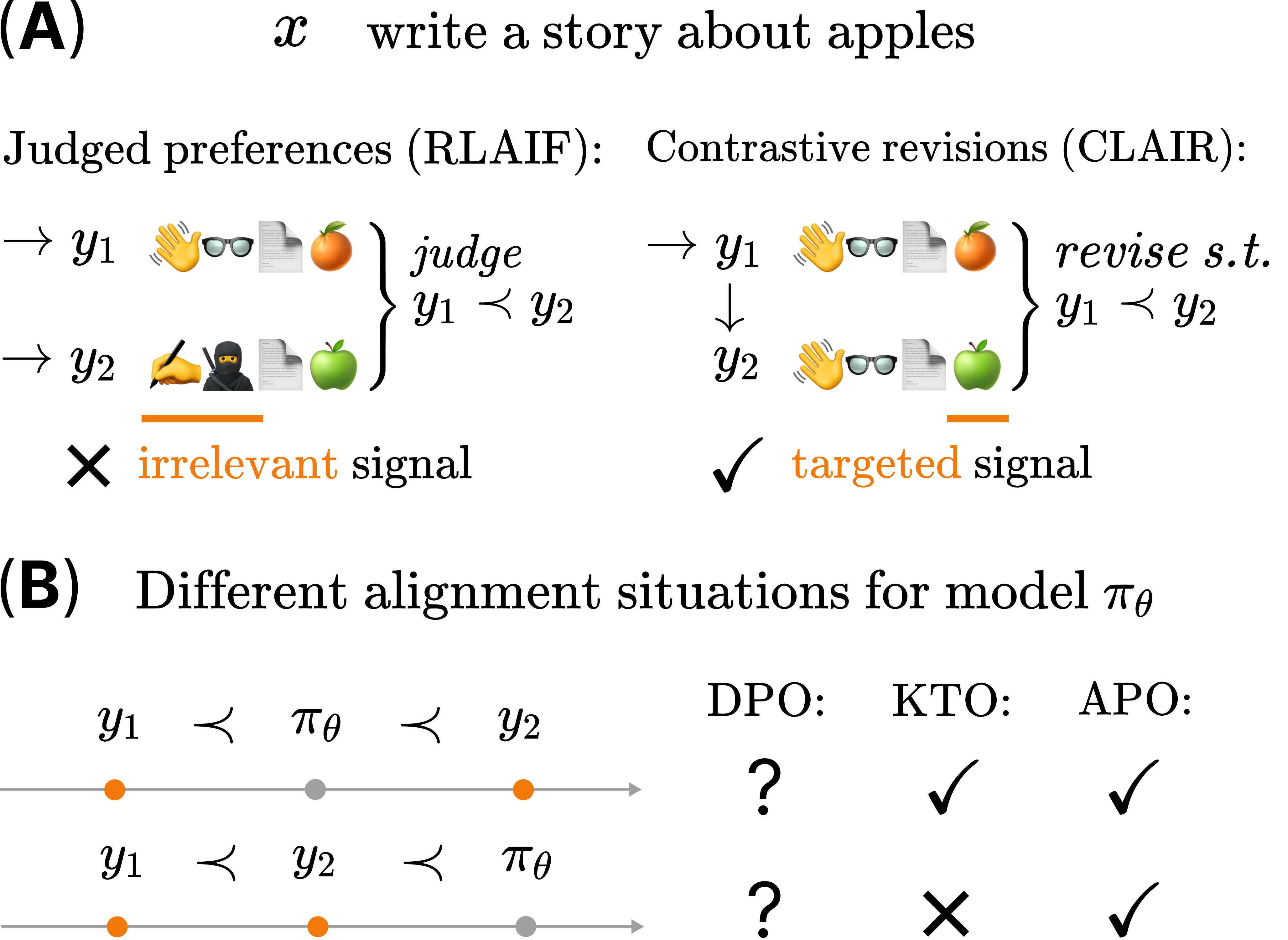 이러한 통찰을 바탕으로, 우리는 Contrastive Learning from AI Revisions (CLAIR)라는 새로운 데이터 생성 방법을 제안한다. 이는 보다 대조적인 선호 쌍을 생성하도록 설계되었다. 또한, 우리는 제어 가능성이 높고 더 안정적인 정렬 목적 함수인 Anchored Preference Optimization (APO)를 제시한다.