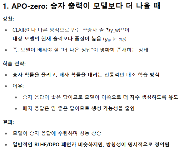 - 승자 출력이 대상 모델보다 품질이 높을 때 → APO-zero가 더 적합 (예: CLAIR, on-policy judge 데이터셋)