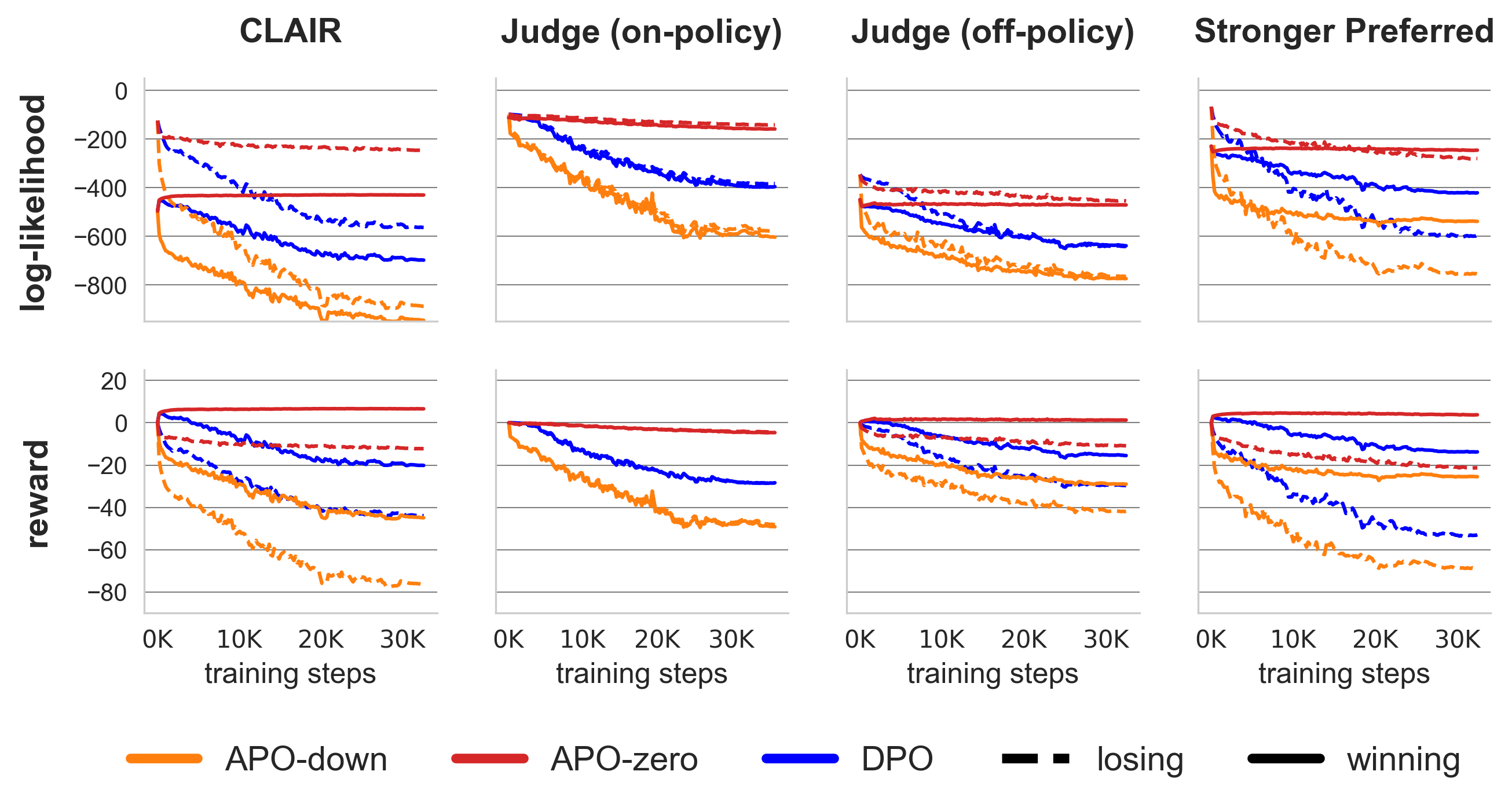CLAIR, on-policy judge, off-policy judge, Stronger Preferred 선호 데이터셋을 사용해 APO-down, APO-zero, DPO 정렬 목표로 학습한 Llama-3-8B-Instruct 모델의 승자/패자 출력에 대한 로그 우도(log-likelihood)와 보상(reward) 변화를 나타냄. 각 데이터셋에서 100개의 홀드아웃 선호 쌍을 사용해 측정했다.