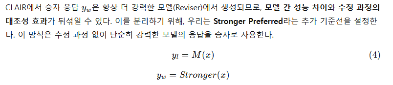 즉, CLAIR의 전제는 “대상 모델과 Reviser 모델의 품질 격차가 존재해야 함”