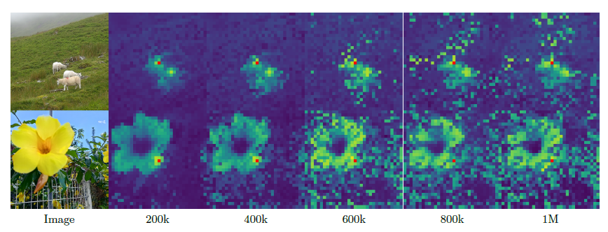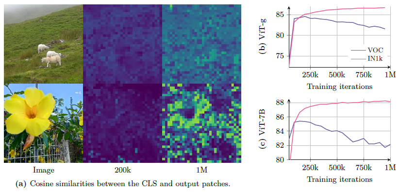 - 초기 학습 이후 시간이 지남에 따라 특성(feature) 성능이 점차 저하되며, 이는 패치 유사도 맵(patch similarity map) 시각화를 통해 확인된다. 이러한 현상은 ViT-Large(약 3억 매개변수) 이상의 대형 모델에서 긴 학습을 진행할 때 나타나며, DINOv2의 확장성을 저해한다.