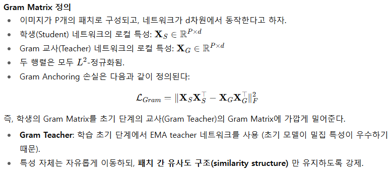- 대규모 학습에서 밀집 특성이 붕괴되는 문제를 해결하기 위해 Gram Anchoring 단계 추가.