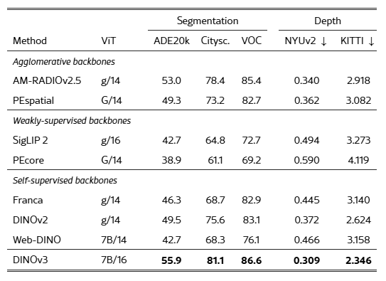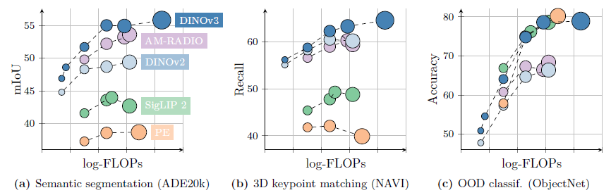 - (b) 밀집 과제(dense tasks)에서 SSL이 가지는 고유한 잠재력을 보여주며, DINOv3는 최신 WSL 모델을 크게 능가한다.