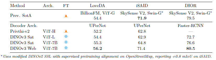 - 실제로 표 18, 표 19에 따르면, frozen DINOv3 웹 모델은 Geo-Bench, LoveDA, DIOR 데이터셋에서 새로운 최고 성능을 기록했다.