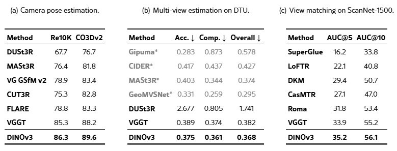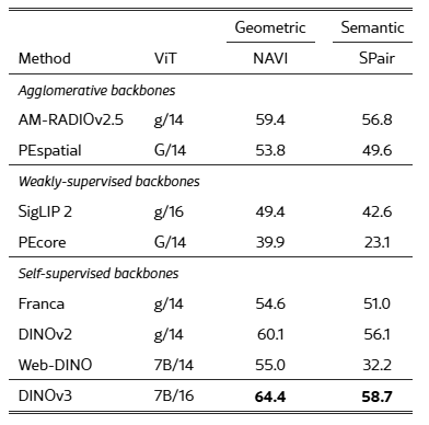 DINOv3의 또 다른 핵심은 밀집 특성 맵(dense feature maps)의 큰 개선이다. DINOv3 SSL 학습 전략은 고수준 의미적 과제(semantic tasks)에서 뛰어난 성능을 내는 동시에, 깊이 추정(depth estimation)이나 3D 매칭과 같은 기하학적 과제(geometric tasks)에 적합한 고품질 특성 맵을 생성하는 것을 목표로 한다.