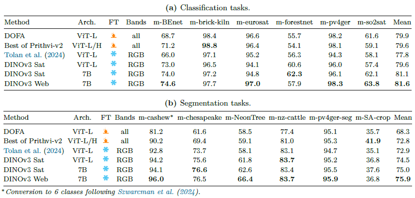 - RGB 입력만을 사용하는 frozen DINOv3 위성 모델은 3개의 분류 과제와 6개 분할 과제 중 5개에서 이전 방법을 능가했다.