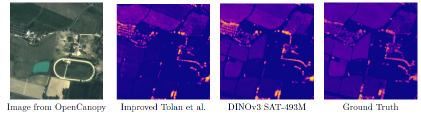 그림 19: Open Canopy 데이터셋에서 DINOv3 7B 위성 모델과 Tolan et al. (2024)의 정성적 비교. 두 모델 모두 448×448 입력 이미지로 디코더 학습. 결과적으로, DINOv3는 필드 내 나무의 정확한 높이와 같은 더 정밀한 지도를 생성함을 확인할 수 있다.