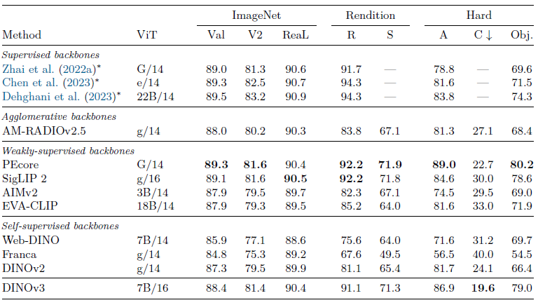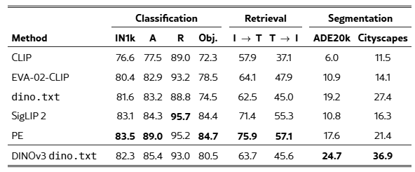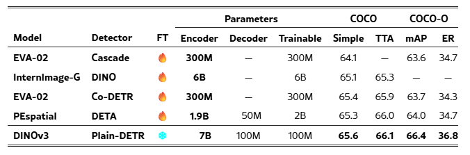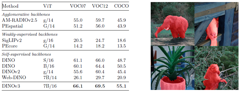 - 특히 frozen vision backbone 상태에서도, 객체 탐지(COCO detection, mAP 66.1)와 이미지 분할(ADE20k, mIoU 63.0) 같은 오랜 컴퓨터 비전 과제에서 최신 성능을 달성하며, 특화된 파인튜닝 파이프라인을 능가한다.