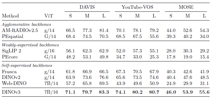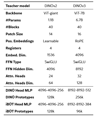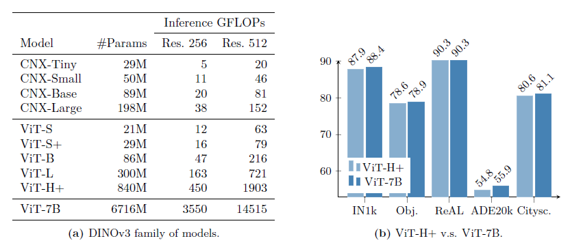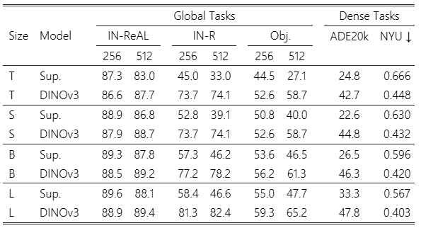 - 두 모델의 상호보완적 강점은 DINOv3 SSL 패러다임의 폭넓은 적용 가능성과 효과성을 잘 보여준다.