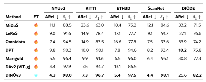 - DINOv3 위성 모델은 위성 특화 사전지식(priors)을 활용해 깊이 추정(depth estimation)과 같은 수치적 회귀(metric) 과제에서 우수하다.