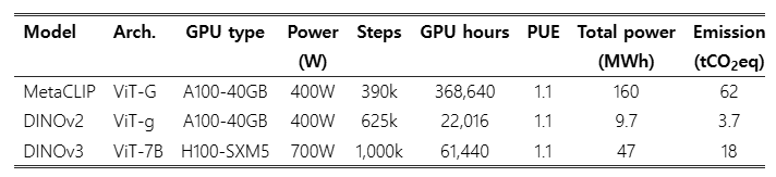 또한 비교 지점으로, 하나의 DINOv3 모델을 학습하는 데 필요한 에너지(47MWh)는 평균 전기차로 약 240,000km 주행하는 데 필요한 에너지와 대략 동일하다.