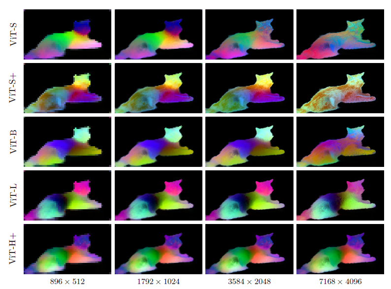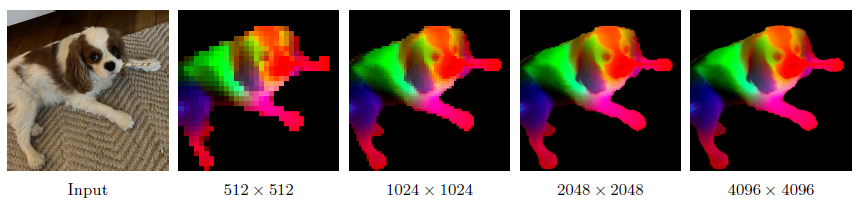 그림 4: 초고해상도에서의 DINOv3. DINOv3의 밀집 특성을 시각화하기 위해, 특성 공간에서 PCA로 계산된 상위 세 개 성분을 RGB에 매핑하였다. PCA가 대상(subject)에 집중하도록, 배경 제거(background subtraction)로 특성 맵을 마스킹하였다. 해상도가 증가할수록 DINOv3는 선명하면서도 의미론적으로 일관된 특성을 생성한다. 추가 PCA 시각화는 Sec. 6.1.1에 제시된다.