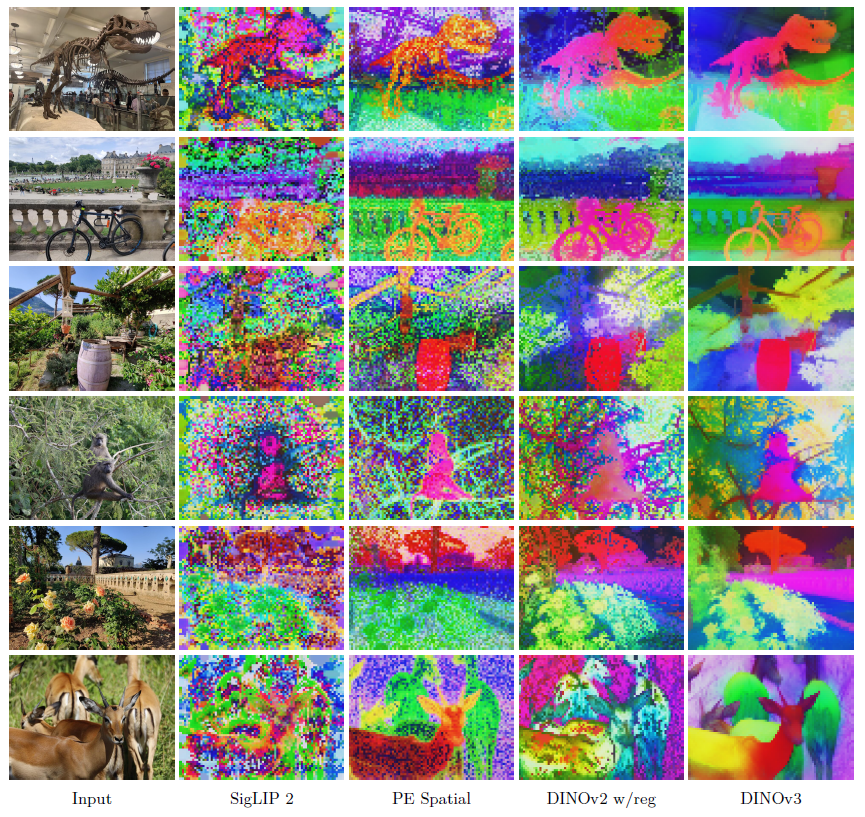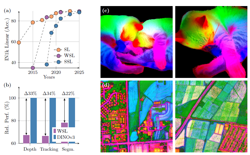 - (c), (d) DINOv3를 자연 이미지(c)와 항공 이미지(d)에 대해 학습한 후 고해상도 이미지에서 얻은 특성을 PCA로 시각화한 결과.